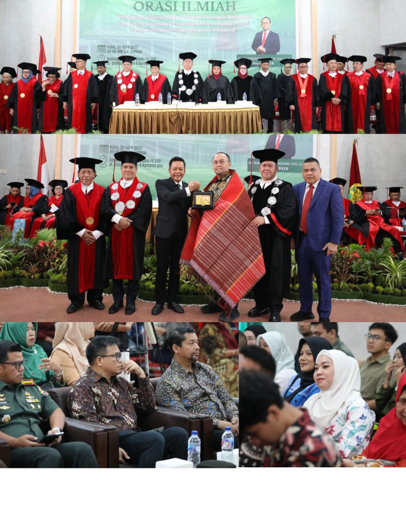 Medan – Dalam rangka memperingati Dies Natalis ke-71, Fakultas Hukum Universitas Sumatera Utara (FH USU) menggelar rangkaian kegiatan Orasi Ilmiah dengan tema: “Hukum dan Moral dalam Pusaran Transaksi Keuangan yang Mencurigakan: Perspektif Kritis terhadap Fungsi PPATK sebagai Penjaga Integritas Finansial.” Perayaan ini diselenggarakan pada 30 April 2025, bertempat di Gedung Peradilan Semu Fakultas Hukum Universitas Sumatera Utara.