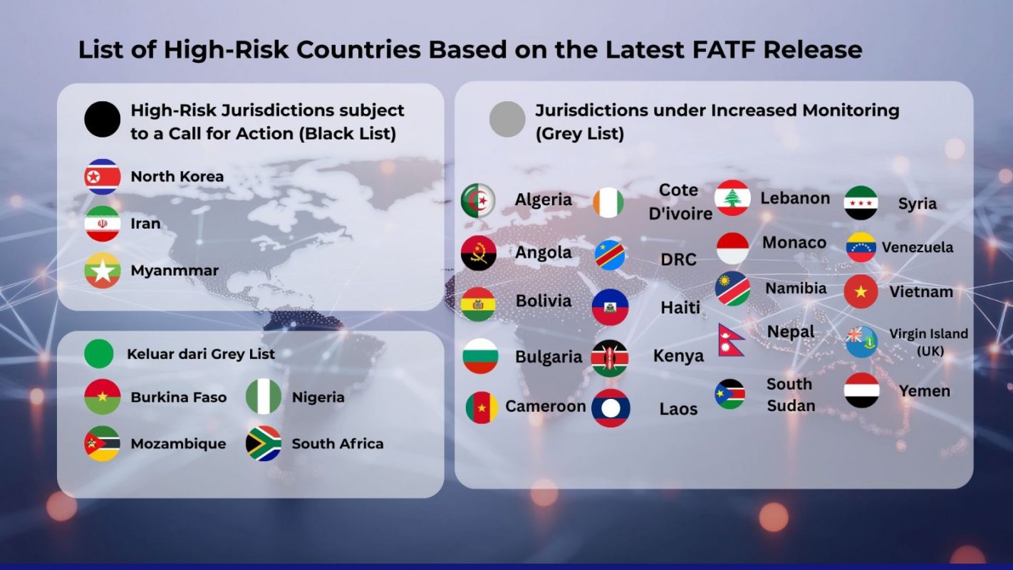 Dalam upaya global memerangi tindak pidana pencucian uang (TPPU), tindak pidana pendanaan terorisme (TPPT), dan pendanaan proliferasi senjata pemusnah massal (PPSPM) , Financial Action Task Force (FATF) telah merilis pembaruan atas daftar negara berisiko tinggi (black list) dan negara dengan peningkatan pengawasan (grey list) pada Oktober 2025. Pembaruan ini berdasarkan hasil sidang pleno FATF yang berlangsung pada 20-24 Oktober 2025 di Paris, Prancis. Negara-negara yang tercantum dalam daftar tersebut dinilai memiliki defisiensi strategis dan fundamental dalam upaya memerangi TPPU, TPPT, dan pendanaan proliferasi senjata pemusnah massal.