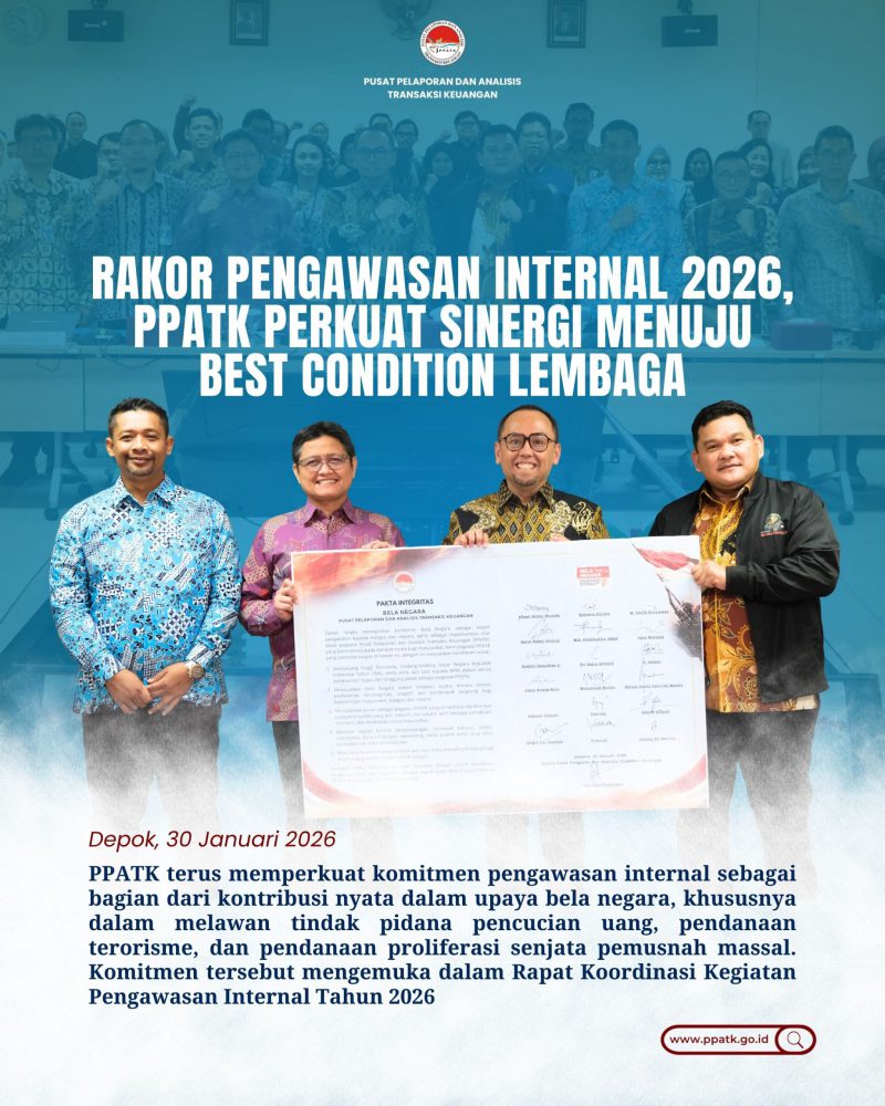 Depok – Pusat Pelaporan dan Analisis Transaksi Keuangan (PPATK) terus memperkuat komitmen pengawasan internal sebagai bagian dari kontribusi nyata dalam upaya bela negara, khususnya dalam melawan tindak pidana pencucian uang, pendanaan terorisme, dan pendanaan proliferasi senjata pemusnah massal. Komitmen tersebut mengemuka dalam Rapat Koordinasi Kegiatan Pengawasan Internal Tahun 2026 yang diselenggarakan pada Jumat, 30 Januari 2026, di Pusdiklat APUPPT, Depok.